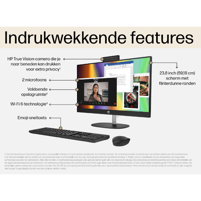 De HP All-In-One 24-cr2650nd combineert een modern, minimalistisch design met praktische eenvoud. Doordat computer en monitor in één behuizing zijn geïntegreerd, houd je je werkplek netjes en overzichtelijk, zonder losse toren of overbodige kabels. Ideaal voor thuiswerken, studie of een strak ingerichte kantooromgeving.