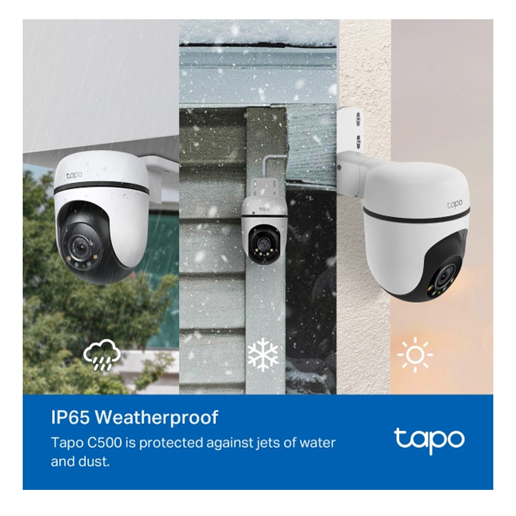 • IP65 weerbestendig: Tapo C500 is bestand tegen waterstralen en stof..